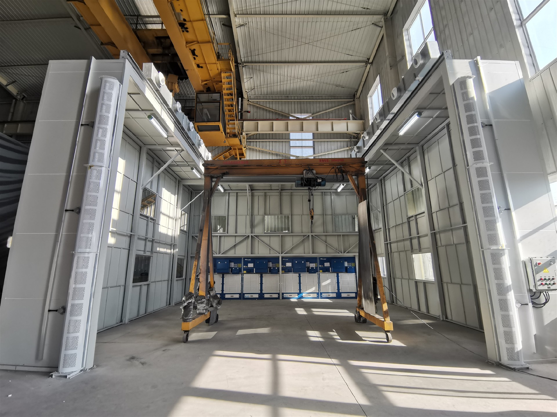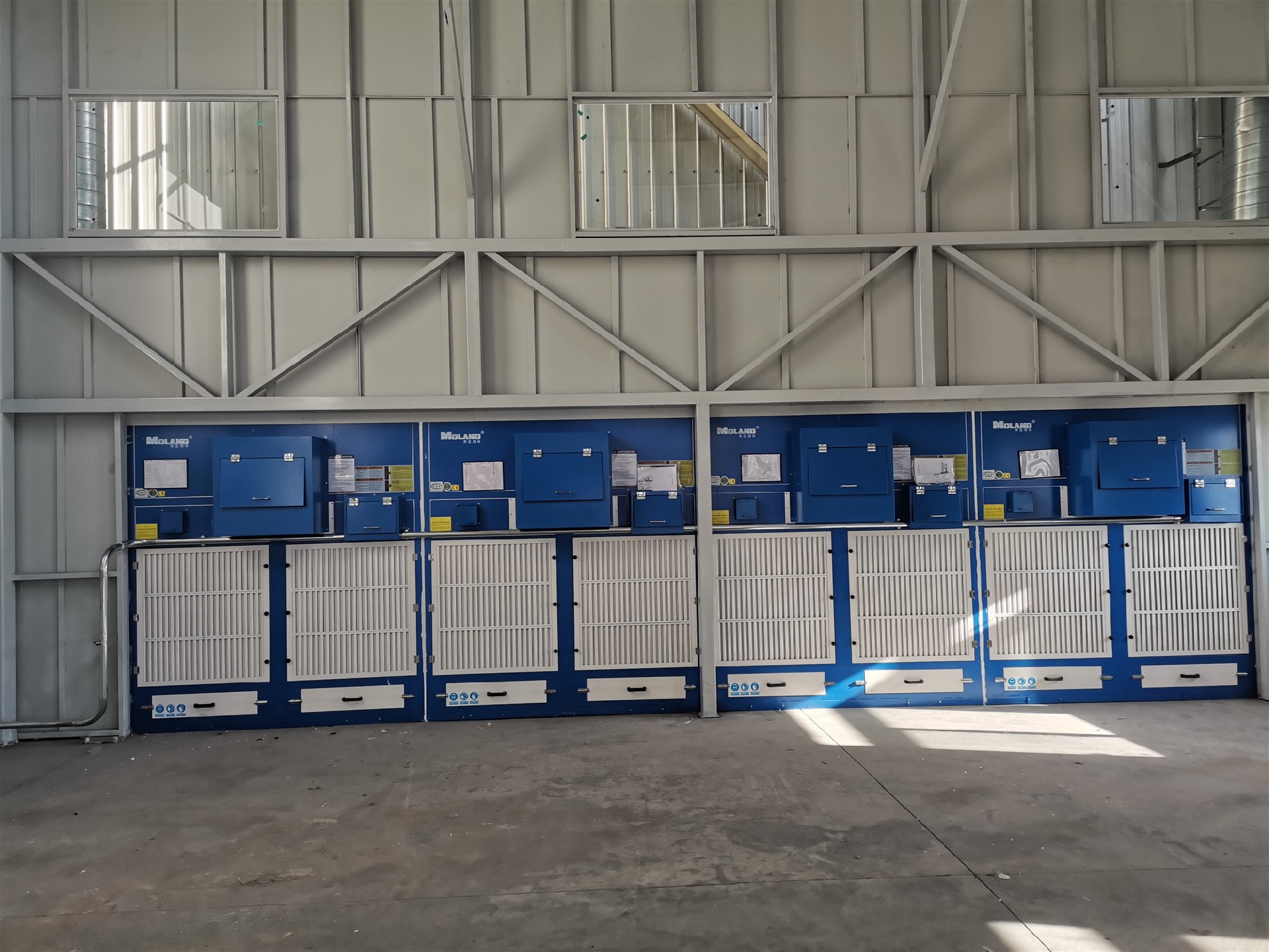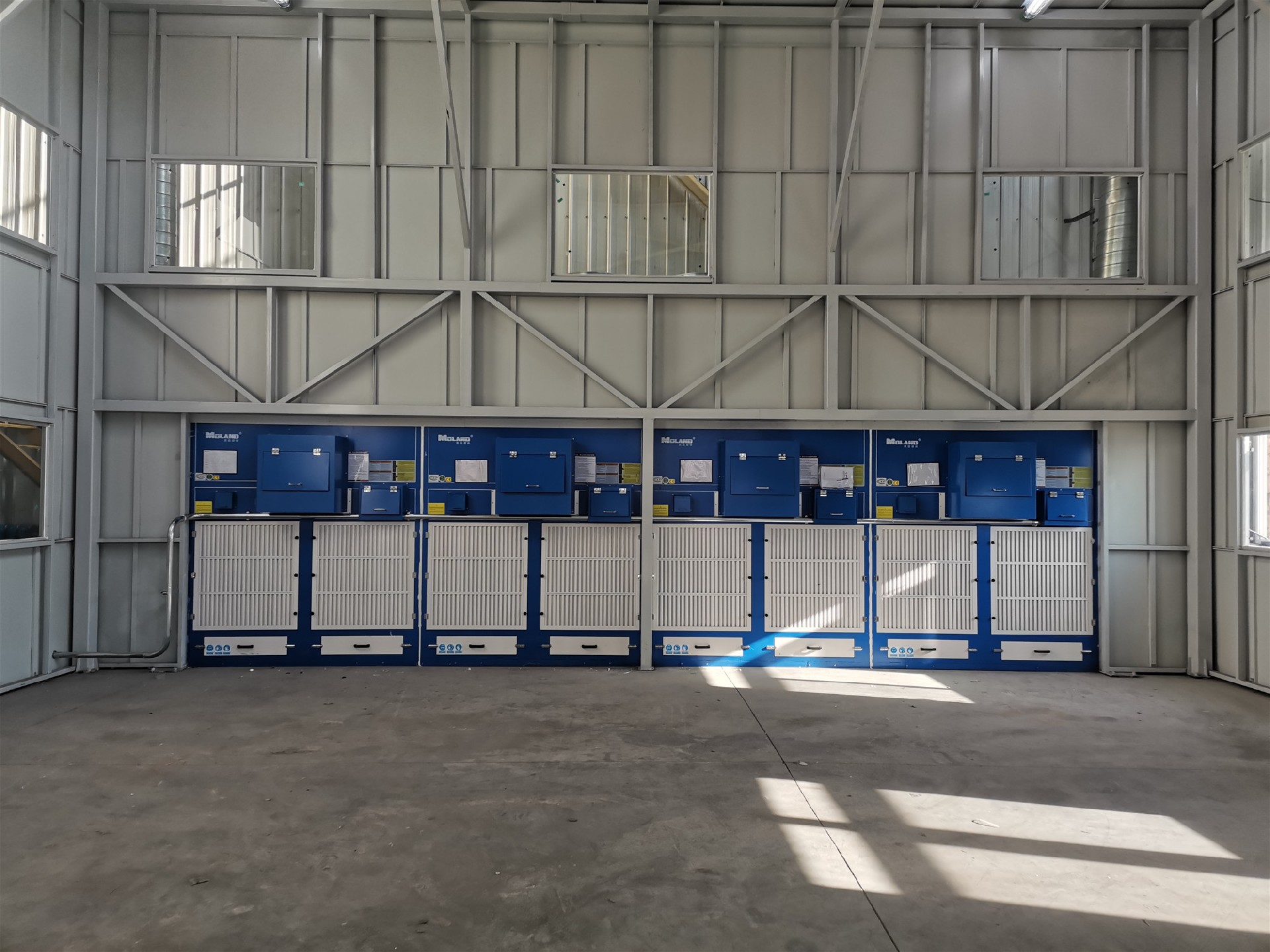 •  科技美藍,智慧除塵,大家好,今天給大家分享大型工件打磨拋光產(chǎn)生的粉塵怎樣處理?這是我們?yōu)槟衬茉囱b備生產(chǎn)企業(yè)鈦合金打磨車(chē)間設計制作的防爆無(wú)塵打磨除塵系統,客戶(hù)現場(chǎng)打磨工件比較大,需要行車(chē)吊裝工件,且打磨時(shí)粉塵量比較大,了解具體工況及跟客戶(hù)溝通后,采用美藍環(huán)保4臺防爆款打磨除塵柜+打磨房的處理方式,打磨房尺寸10m(長(cháng))*10m(寬)*6m(高),鋼結構整體框架,防腐蝕龍骨搭建,板材選用碳鋼噴塑鈑金材質(zhì),在房頂兩側加裝送風(fēng)管道,凈化后的空氣通過(guò)管道進(jìn)入射流口吹到房間里,實(shí)現空氣內循環(huán)。并在房頂加裝一個(gè)可伸縮的電動(dòng)天幕,吊裝工件的時(shí)候收縮,作業(yè)的時(shí)候可打開(kāi)覆蓋房間。為達到良好的送風(fēng)效果,在門(mén)口兩側各加裝風(fēng)幕,形成一個(gè)無(wú)形的門(mén)簾,防止粉塵不外溢。